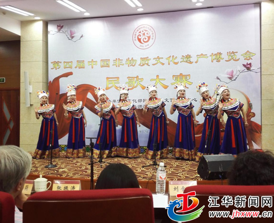 江华新闻网讯(通讯员 陈永祥)历时四天的第四届中国非物质文化遗产博览会民歌大赛决赛,在山东济南圆满落幕。9月25日上午,济南国际会展中心广场舞台隆重举行了民歌大赛优秀节目展演及颁奖仪式。 本次大赛由文化部、山东省人民政府主办,通过参加全国层层选拔,是“中国原生民歌大赛”的延续。江华瑶族自治县选送的“月儿朦朦亮”小组唱,代表湖南民歌改编组参加总决赛,并获得优秀演唱奖。