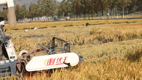 从空中俯瞰,村庄与公路、稻田交织一起,在夕阳余晖的映衬下,泛起金黄色的稻浪,大地仿佛披上一层“黄金衣”,稻田里,一台台中型收割机在农机师傅的驾驭下来回穿梭,将颗粒饱满、黄澄澄的稻谷尽收其中,机械化的收割方式让农户们兴奋不已。